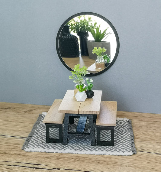 Miniatur-Essgruppe im Maßstab 1:12, Schwarz & Holz, moderne Miniatur-Puppenhausmöbel (perfekt für Ikea-Puppenhäuser)
