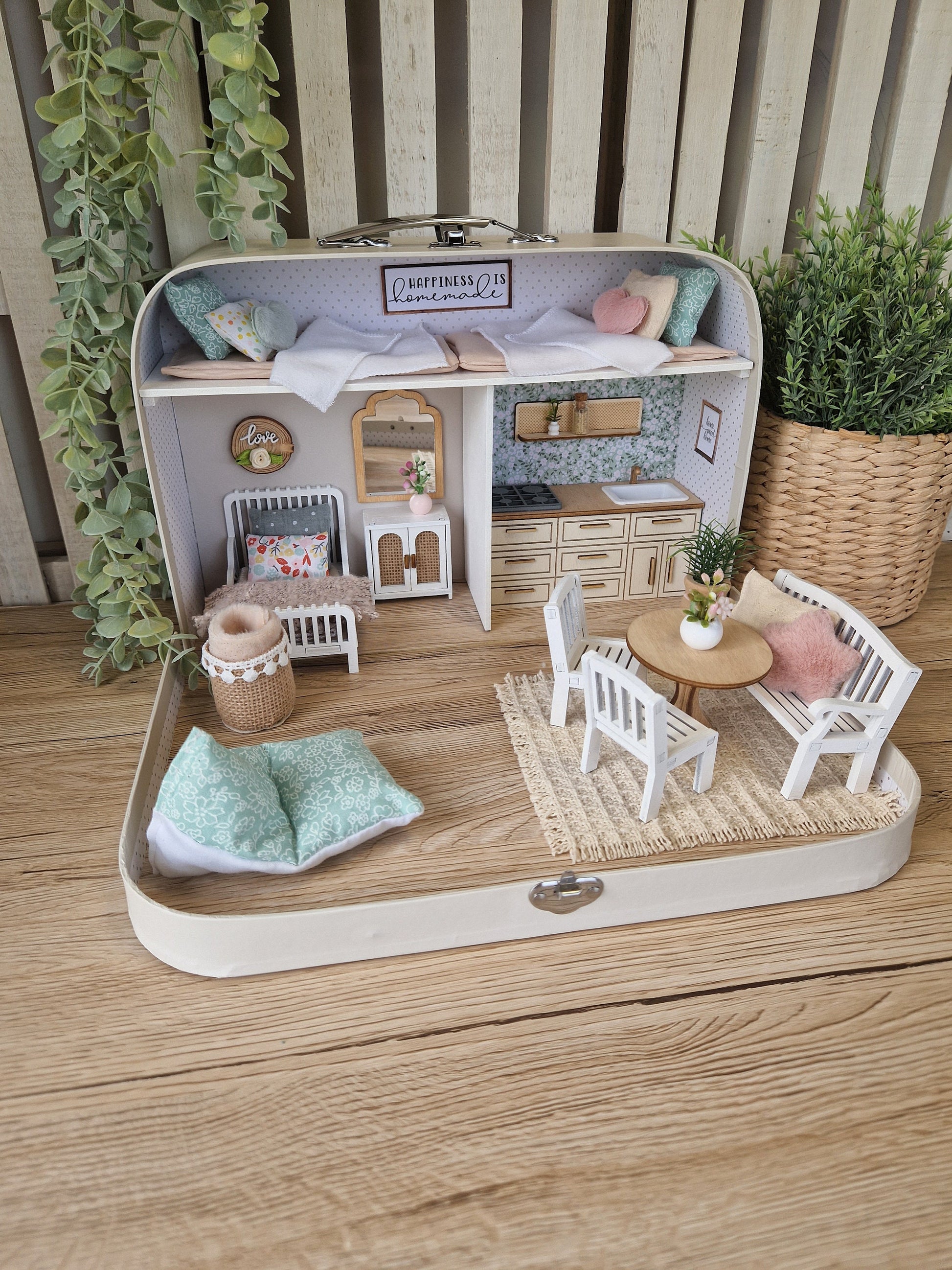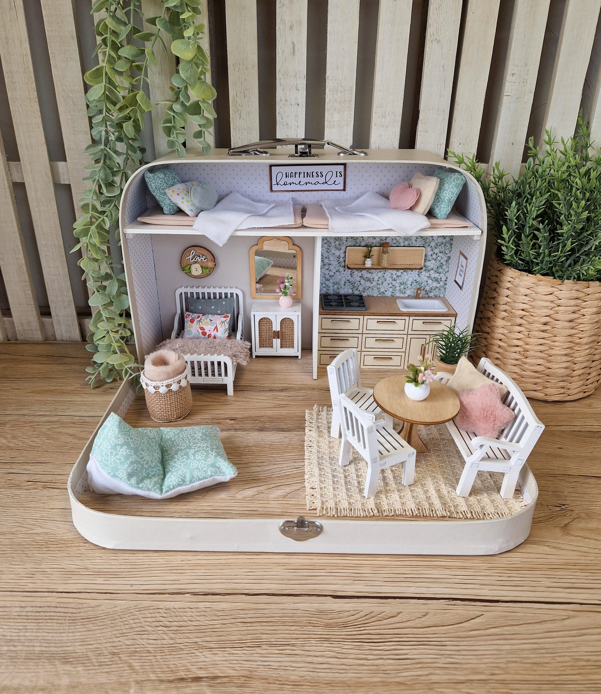 Dieser handgefertigte, große Puppenhauskoffer regt die Fantasie an. Er ist komplett ausgestattet mit Möbeln, Stoffen und Dekorationselementen und eignet sich perfekt zum Spielen zu Hause oder unterwegs. Ob drinnen, draußen oder auf Reisen – dieser tragbare Koffer ist ideal für kreative Abenteuer. Die lasergeschnittenen Holzmöbel werden sorgfältig von Hand zusammengebaut und verklebt, und alle Textilien werden von uns genäht. Die Wände des Koffers sind mit buntem Musterpapier verziert, und der Boden besteht aus einer Folie in Holzoptik.
