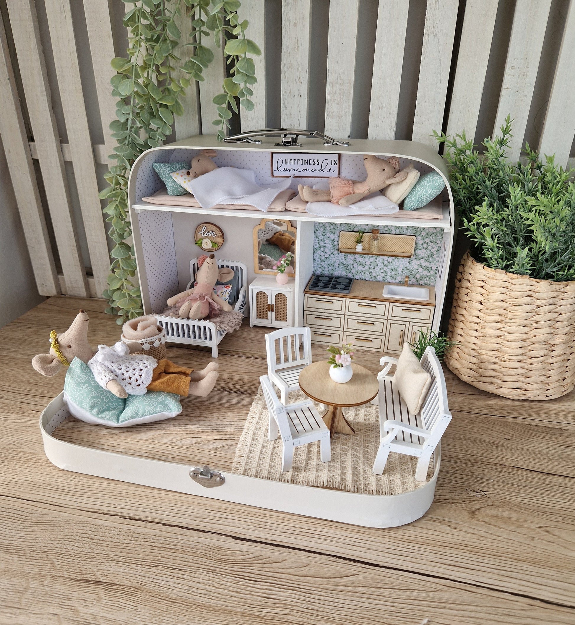 Die Wände und die Küche im Koffer sind fest integriert, alle anderen Möbel sind beweglich. Alle abgebildeten Gegenstände (Möbel, Textilien und Dekoration) sind im Lieferumfang enthalten und lassen sich im geschlossenen Koffer ordentlich verstauen. Er ist ideal für Maileg-Mäuse oder andere Puppen mit einer Größe von 10–16 cm.