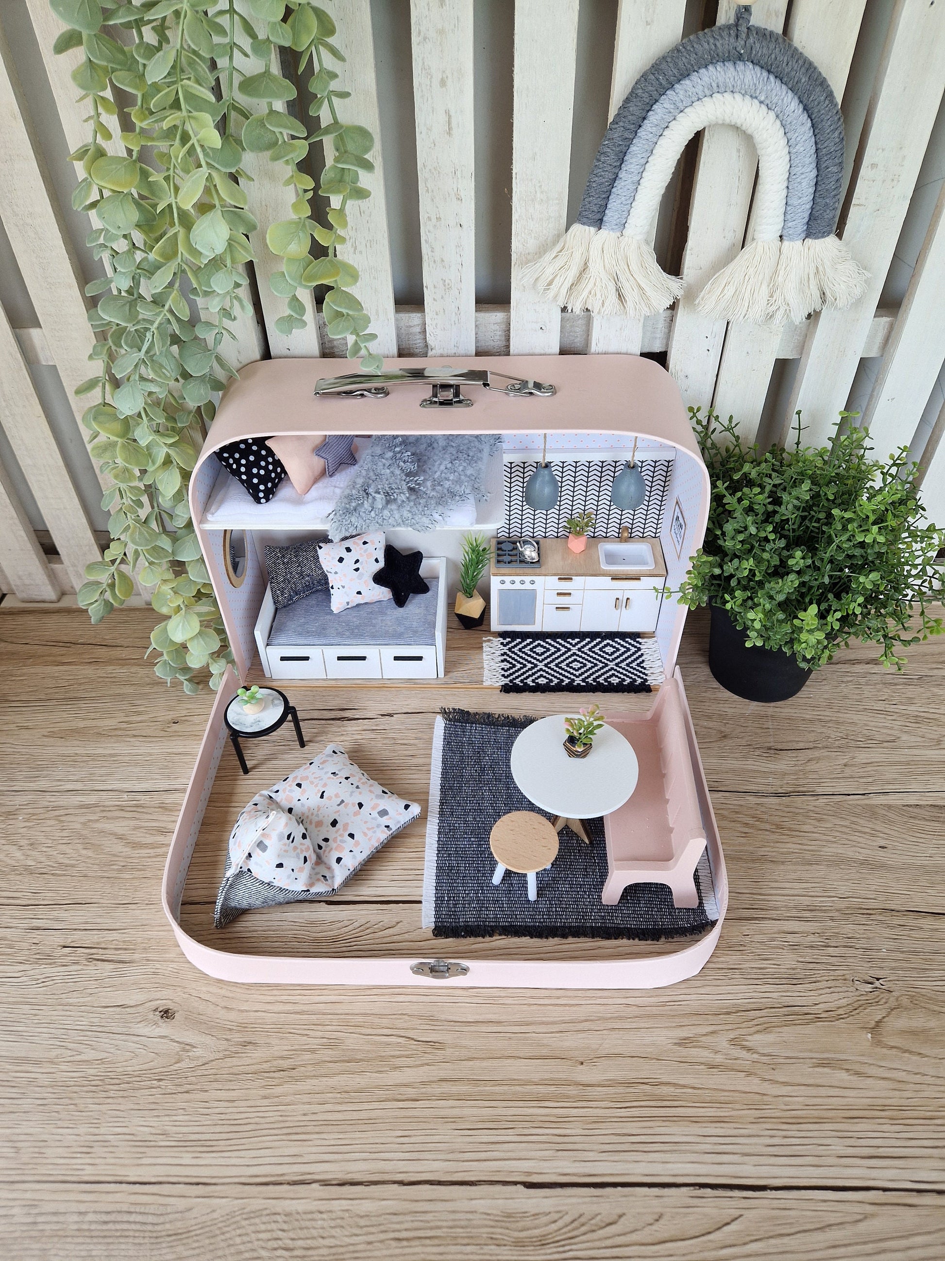 Unser mittelgroßer Puppenhauskoffer ist ebenfalls handgefertigt und enthält Möbel, Stoffe und Dekorationselemente für grenzenlose Fantasie. Er ist tragbar, sodass Kinder überall spielen können – drinnen, draußen oder auch bei Freunden und Familie. Die lasergeschnittenen Holzmöbel werden von Hand montiert, und alle Textilien werden in unserer eigenen Werkstatt genäht. Die Kofferwände sind mit buntem Musterpapier ausgekleidet, und der Boden ist mit einer Folie in Holzoptik versehen.