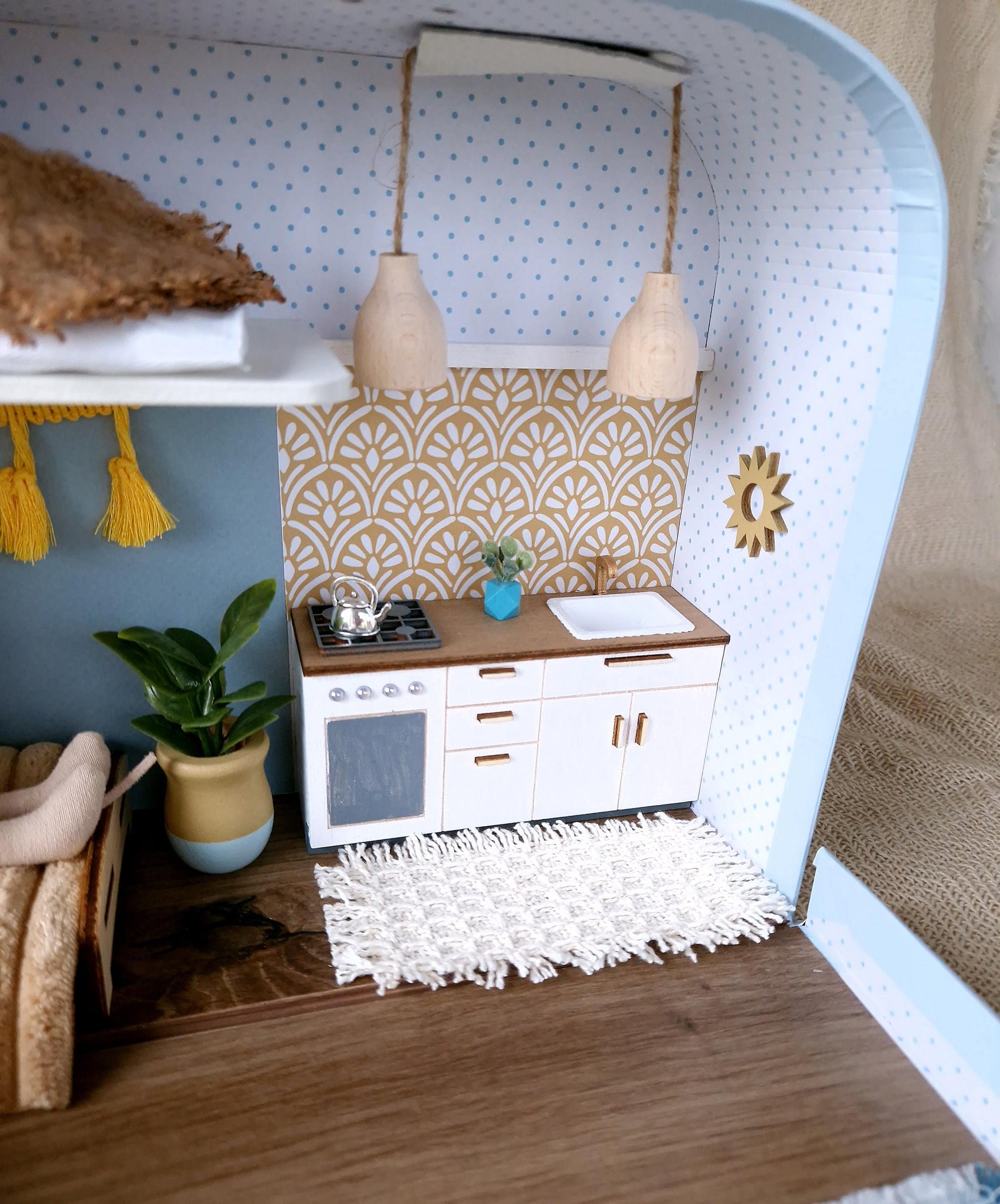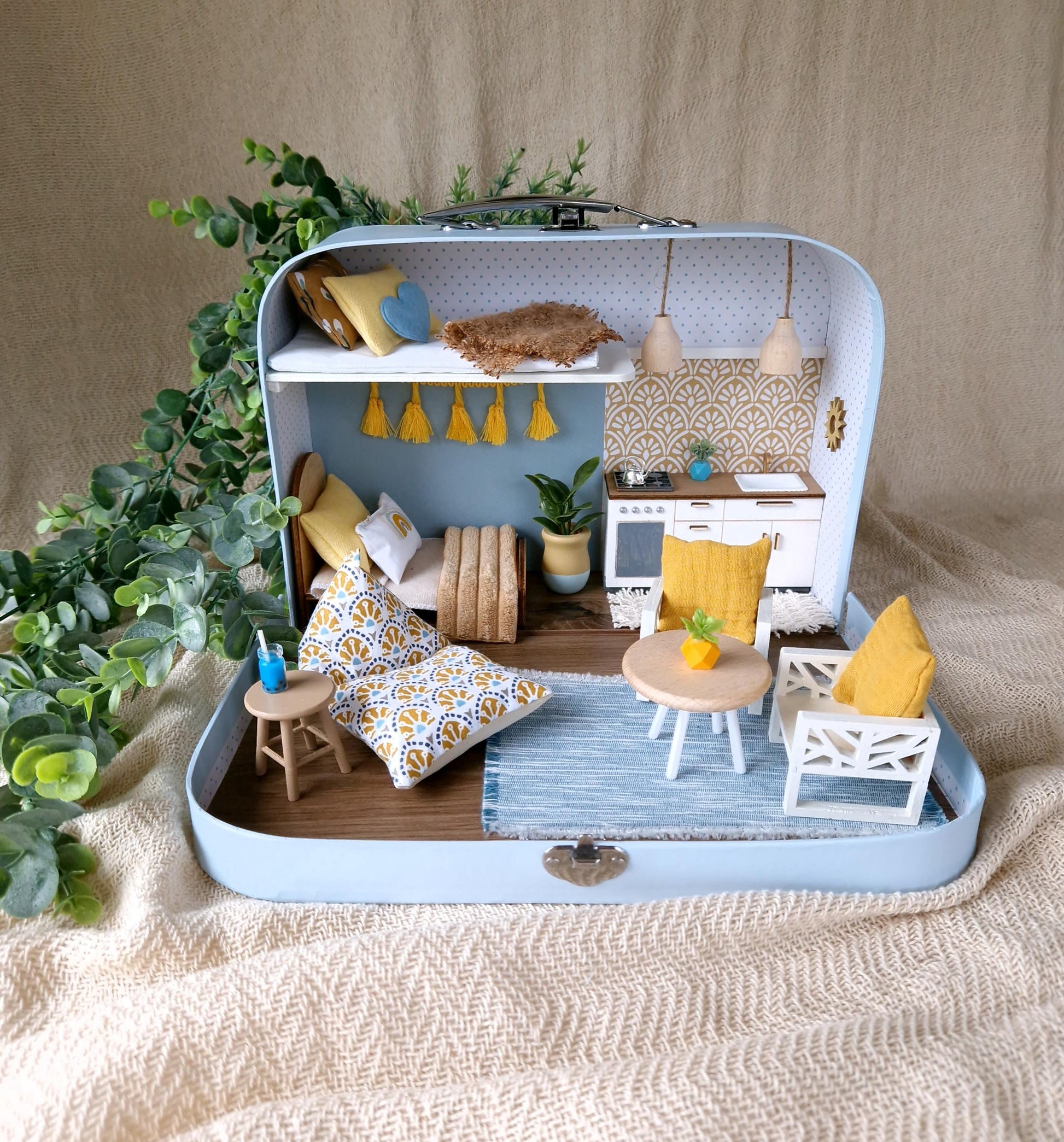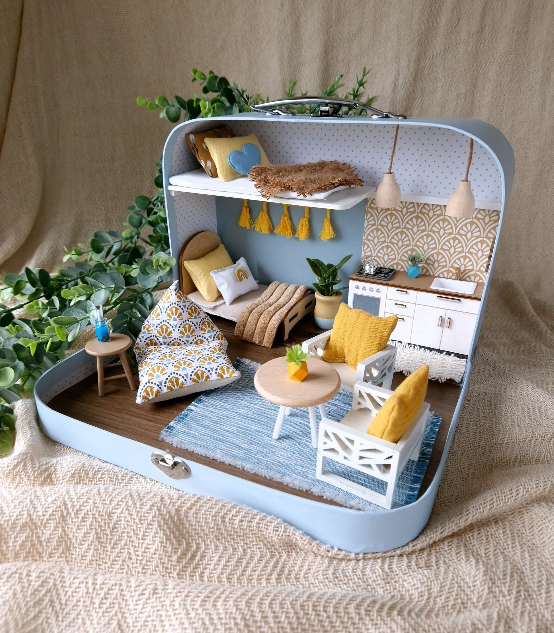 Tagträume & Sonnenschein – Puppenhaus im mittleren Koffer