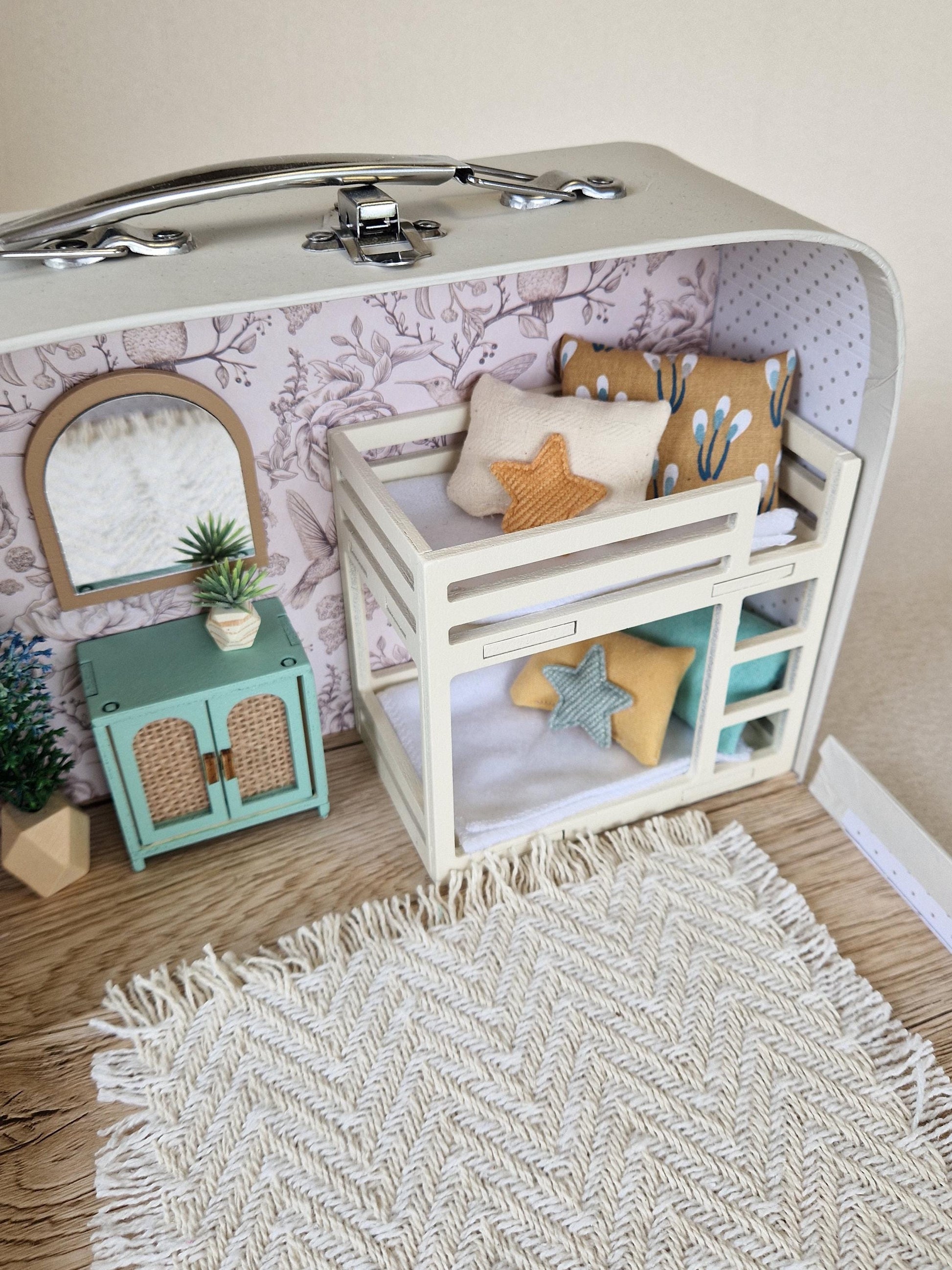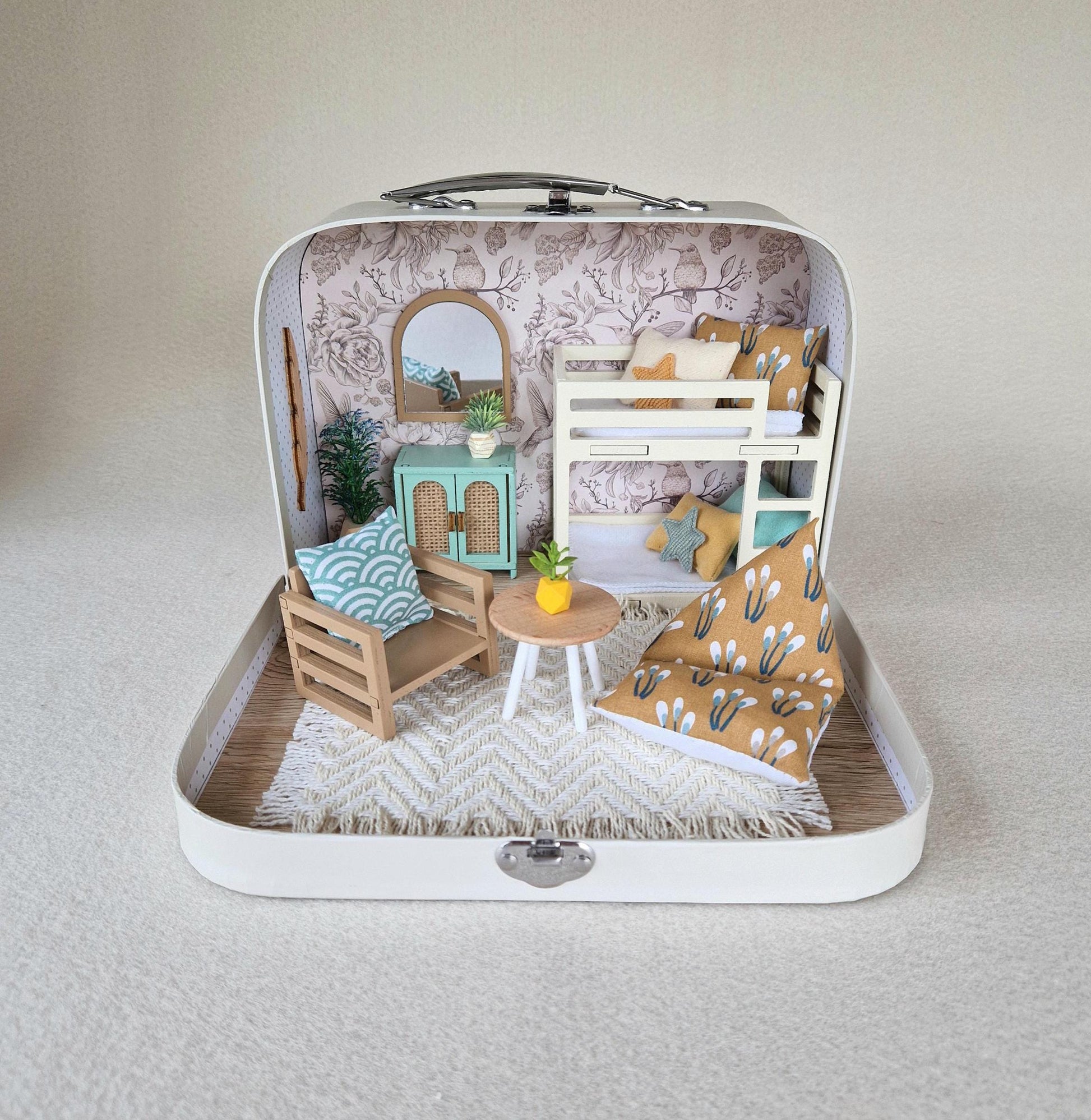 Unser kleiner Puppenhauskoffer ist ebenfalls handgefertigt und enthält Möbel, Stoffe und Dekorationselemente für grenzenlose Fantasie. Er ist tragbar, sodass Kinder überall spielen können – drinnen, draußen oder auch bei Freunden und Familie. Die lasergeschnittenen Holzmöbel werden von Hand montiert, und alle Textilien werden in unserer eigenen Werkstatt genäht. Die Kofferwände sind mit buntem Musterpapier oder Miniatur-Wandbildern beklebt, und der Boden ist mit einer Folie in Holzoptik gestaltet.