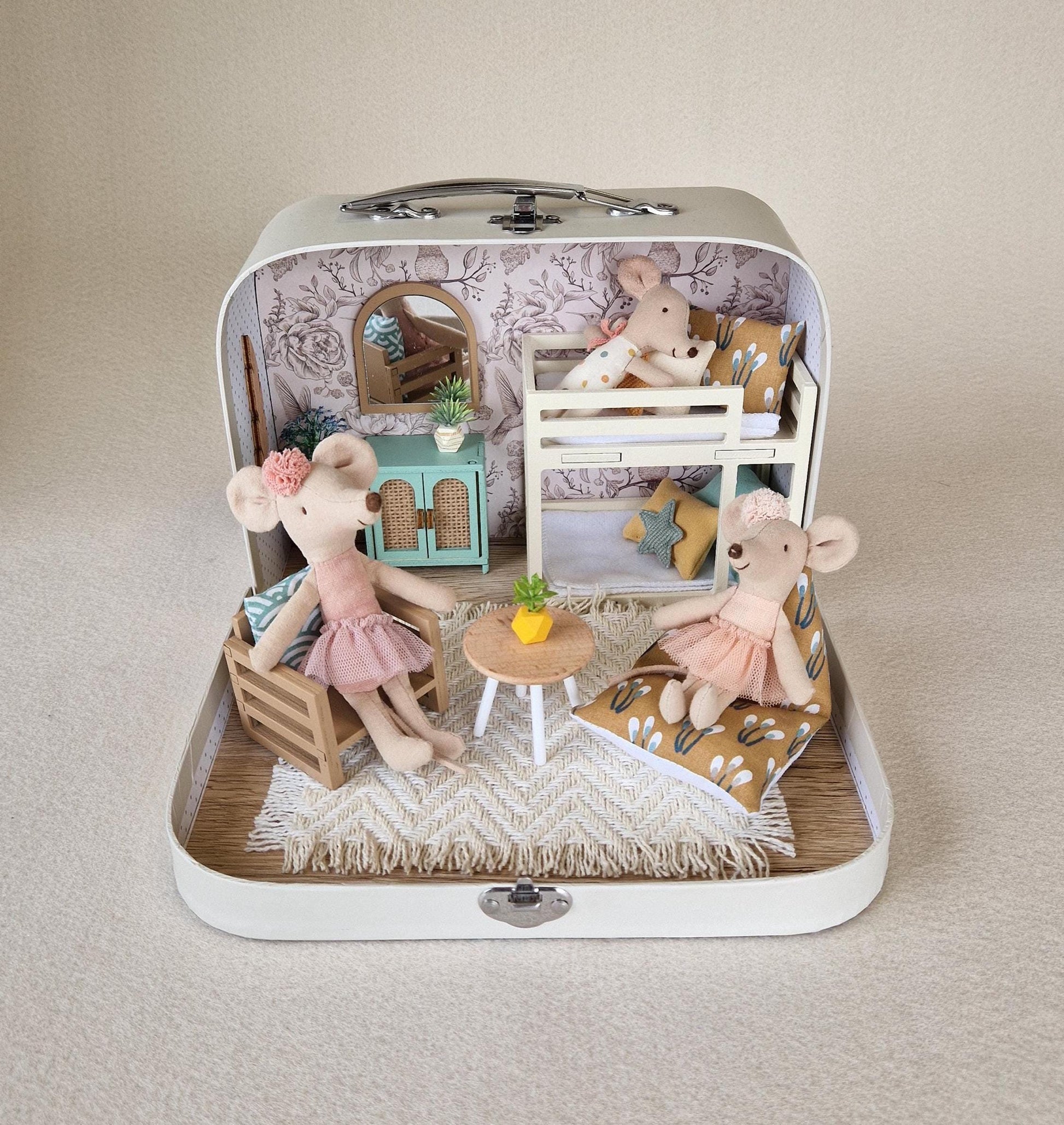 Alles, was auf dem Foto zu sehen ist (Möbel, Textilien und Deko), ist im Koffer enthalten und kann im geschlossenen Zustand darin verstaut werden. Ideal für Maileg-Mäuse oder kleine Puppen zwischen 10 und 14 cm.